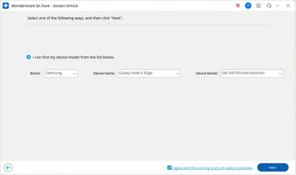 On the following window, opt for “Samsung” as the brand and choose the “Remove without Data Loss” option. Here, enter mobile details like “Brand,” “Device Name,” and “Device Model” before agreeing to the warning.