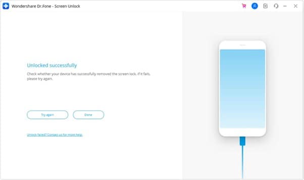 In the Download Mode, Dr.Fone will automatically start removing the screen lock, so tap “Done” and start using the phone with all its data intact.