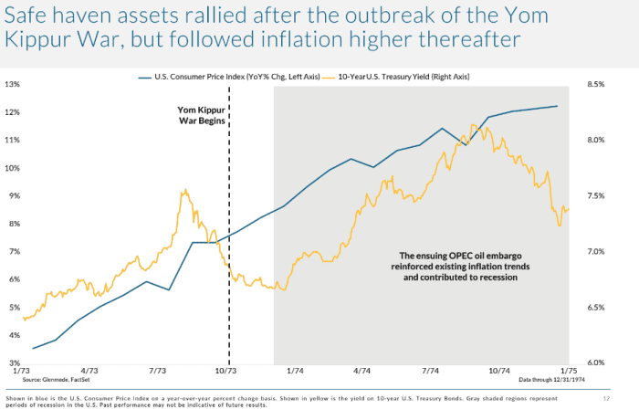 History provides some guide about the possible trajectory that markets and inflation might take following the outbreak of a war in the Middle East. After the Yom Kippur War of 1973 between Israel and a coalition of Arab states led by Egypt and Syria, U.S. government debt rallied for a few months on its safe-haven status, pushing the 10-year yield below 7%.