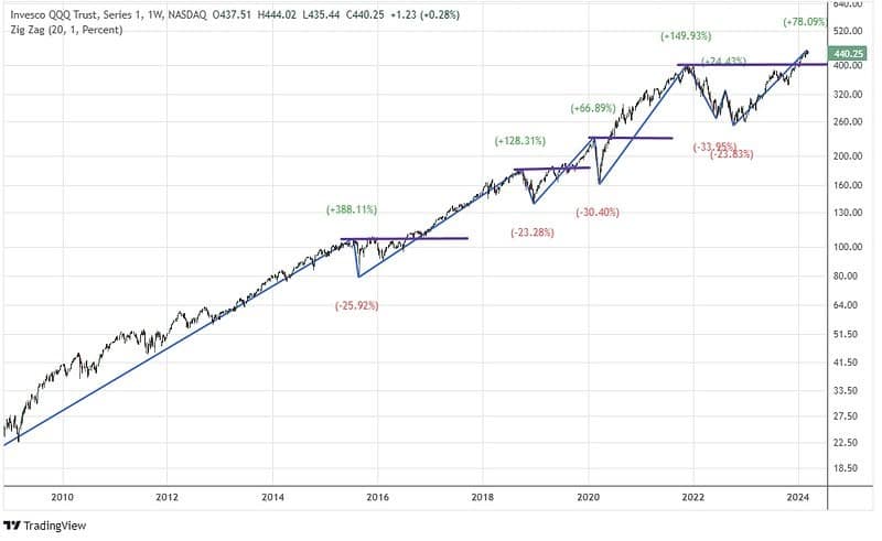 - Since the 2022 low, the QQQ has rallied as much as 78%.