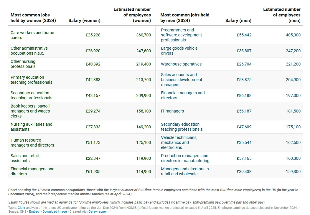 Table showing the 10 most common occupations (those with the largest number of full-time female employees and those with the most full-time male employees) in the UK, and their respective median annual salaries (by Ciphr, source: ONS).