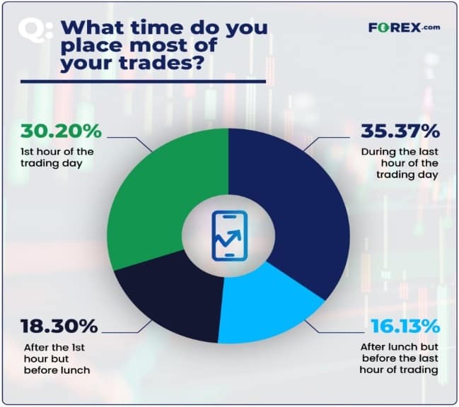 Examining various asset classes, Forex traders were found to have an inclination towards the first hour of the trading day – 38% prefer this time for executing most of their trades. Additionally, FX traders are least likely to trade after lunch but before the last hour, suggesting a focus on early opportunities.